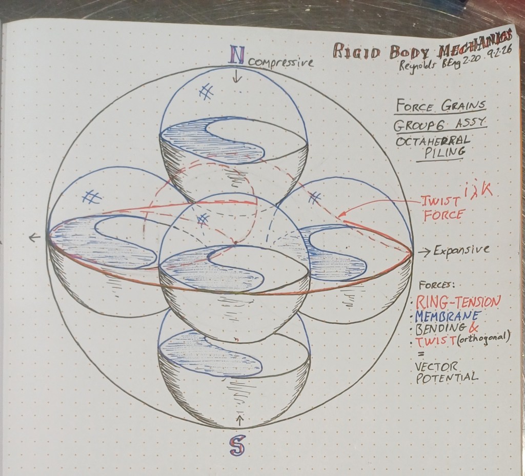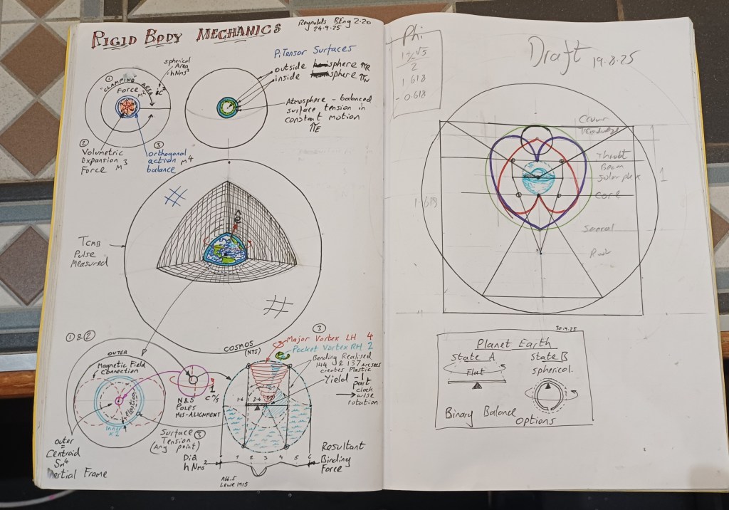 The notebook binary balance diagram and φ box (1.618 / 0.618) directly encode this transition. Current observations confirm the low-energy spherical damping; the model predicts restoration to the 365-day harmonic when the brake relaxes.Reynolds BEng 2.20Rigid Body Mechanics Notebooks, 2025–2026This version is more focused on the math/physics mechanics, with clear equations, exact numbers, and minimal interpretive language. Insert the notebook image after the first paragraph for visual reference