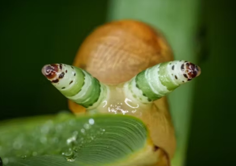 A tiny parasite (the flatworm Leucochloridium paradoxum, known as the green-banded broodsac) invades the snail’s body. It doesn’t just live inside it. It hijacks it. The parasite migrates to the snail’s eye-stalks (its tentacles). It swells them up, fills them with colorful, pulsating sacs that throb like a living disco light — bright green, black, and red bands pulsing dozens of times per minute. The snail can no longer retract its tentacles. Worse, its behavior changes completely: instead of staying hidden in the shade, the infected snail is driven to climb high up a tall plant or blade of grass, fully exposed in the sunlight.The pulsating tentacles now look exactly like a juicy, wriggling caterpillar — the favorite food of birds. The snail has been turned into a bright, flashing billboard that screams one message to the world:“Eat me.” And birds do. They rip off the tentacles, consume the parasite’s larvae, and the cycle continues inside the bird — until droppings spread new eggs for the next snail to accidentally eat.