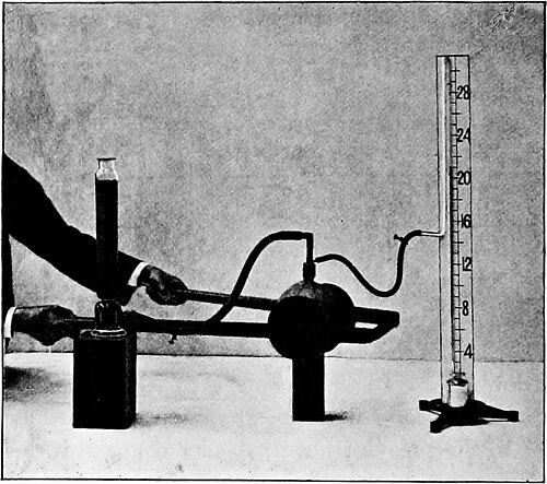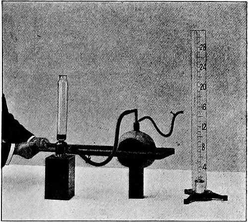 To show that there is an effort to expand the bag, while the pinch is on, it is only necessary to bring the bag into communication with a pressure-gauge, when the mercury shows that the pressure in the bag is only half of that of the atmosphere outside the bag.