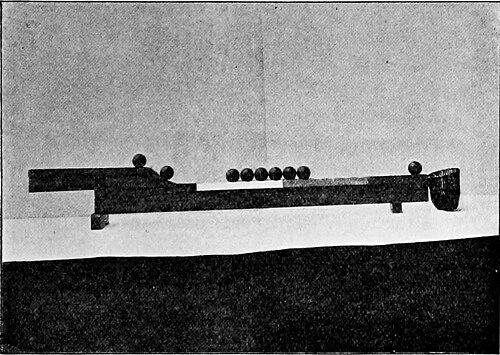 nucleus, and the other balls, higher up, represent the medium, which is strictly limited. The gap between these two sets of balls represents the inequality which is to propagate through the medium for a distance of 18″, as soon as the inequality receives an impulse by the removal of the block on the upper chase, when the ball runs down, and, as you see, the nucleus has advanced 18″.