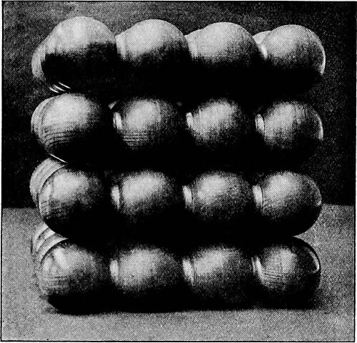 The curvature as shown in model 3, in which the grains are in a bowl in two layers, the bowl being somewhat tilted, is very evident in the lines of grains in the lower layer which extend beyond the grains in the upper layer. And the conformation of the lines of grains in the upper layer may be traced.
